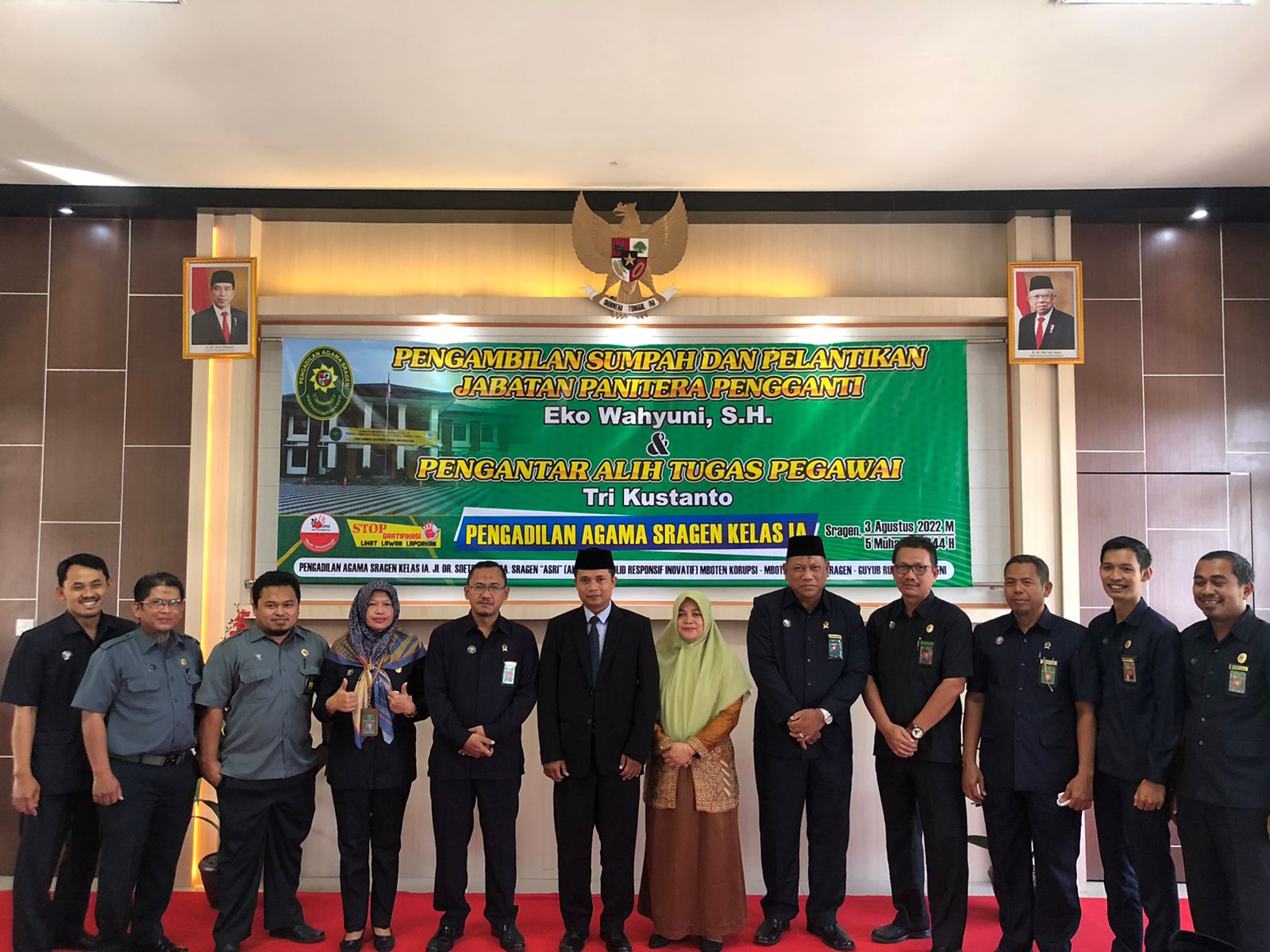 Acara Pelantikan oleh Ketua Pengadilan Agama Sragen, Drs. Lanjarto, MH yang kemudian dilanjutkan dengan Pengambilan Sumpah Eko Wahyuni, SH. menjadi Panitera Pengganti Pengadilan Agama Sragen. Dalam acara Pengambilan sumpah tersebut menjadi saksi adalah Drs. Amir, Nisfatul Laili, S.Sy, dan Dr.M. Nur Hasan Latief, S.H.I., S.H., M.M. Setelah acara pengambilan Sumpah selesai, dilanjutkan dengan perkenalan dari Panitera Pengganti Pengadilan Agama Sragen, Eko Wahyuni SH., MH.