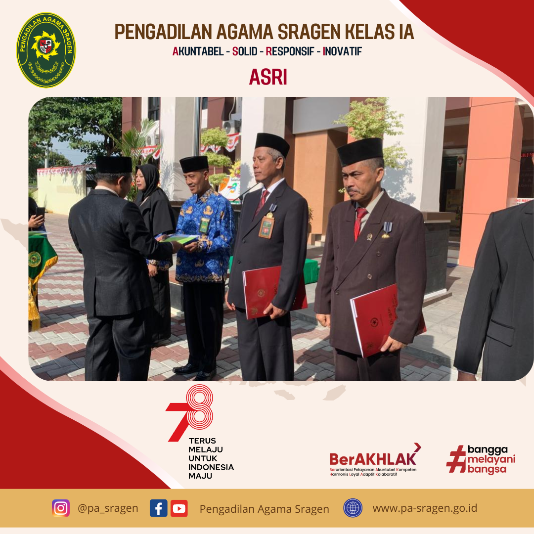 Pada Acara Memperingati 17 Agustus 1945 yang ke 78 Tahum, Wakil Ketua PA Sragen Drs.Juaini,S.H. memberikan Penyematan Tanda Kehormatan Satya Lencana Karya Satya XX dan XXX tahun dan Penyerahan Piagam Karya Sewindu dan Dwi Windu Tahun 2023. Berikut kami lampirkan daftar nama penerima penghargaan Tanda Kehormatan Satya Lencana Karya XXX tahun dan Penyerahan PIAGAM Karya Sewindu dan Dwi Windu Tahun 2023