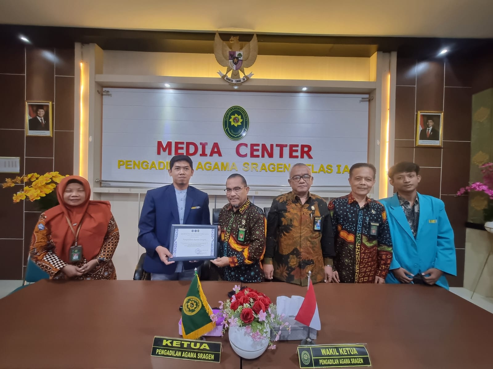 Acara diakhiri dengan penyerahan piagam penghargaan dan cinderamata kepada Ketua Pengadilan Agama Sragen sebagai bentuk apresiasi dan ucapan terimakasih atas kerjasama dan dukungan yang telah diberikan sebagai tempat pelaksanaan kegiatan magang pada periode September dan Oktober secara simbolis kepada ketua pengadilan agama. Dilanjutkan penyerahan sertifikat magang secara simbolis kepada dosen pembimbing Universitas Muhammadiyah Surakarta. Acara ditutup dengan foto bersama.